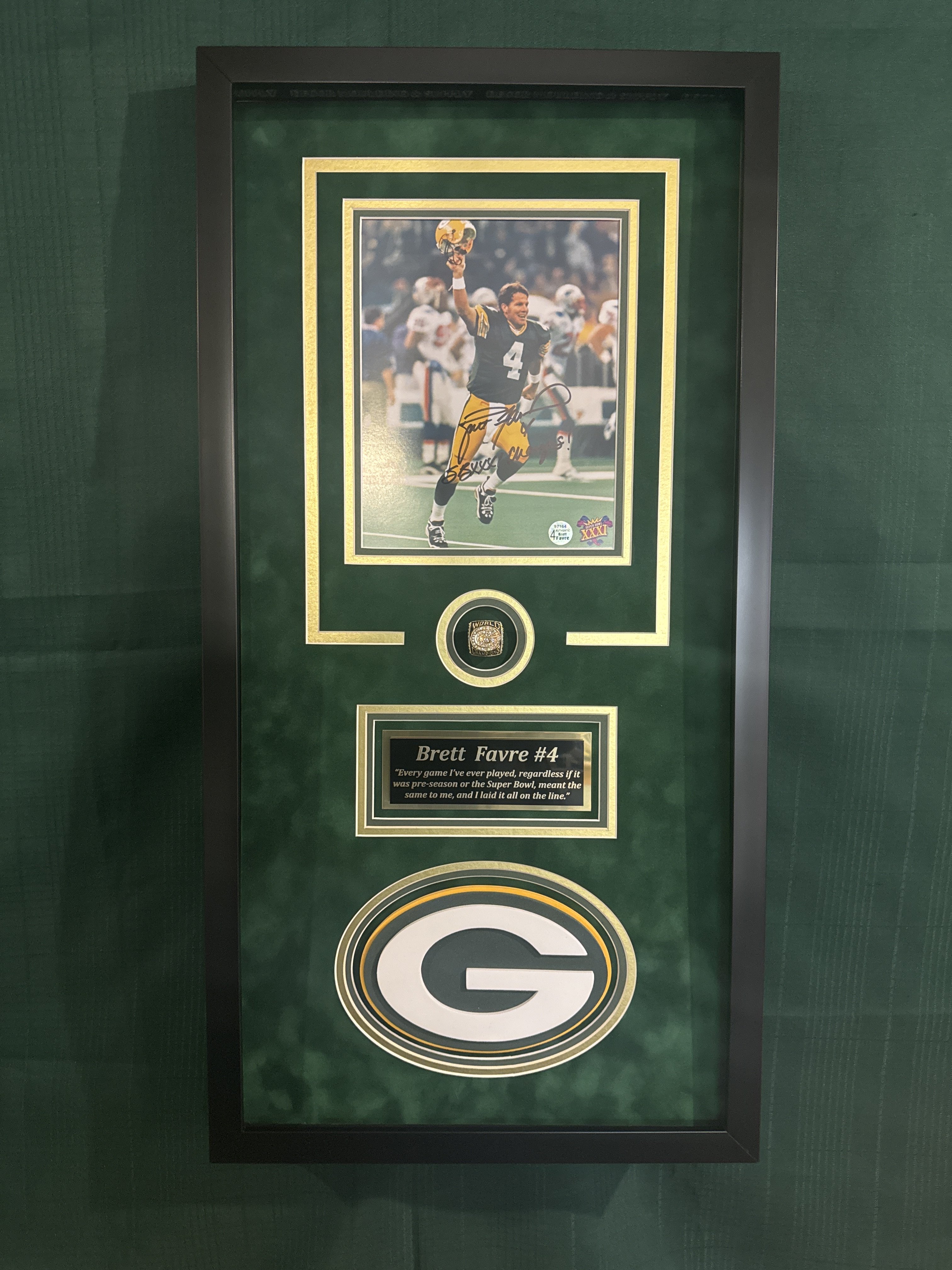 16 x 32 Shadow box with autographed 8 x 10 and replica Super Bowl 31 ring. Brett has added the inscription 95 96 97 MVP. A must have for the Favre fan!