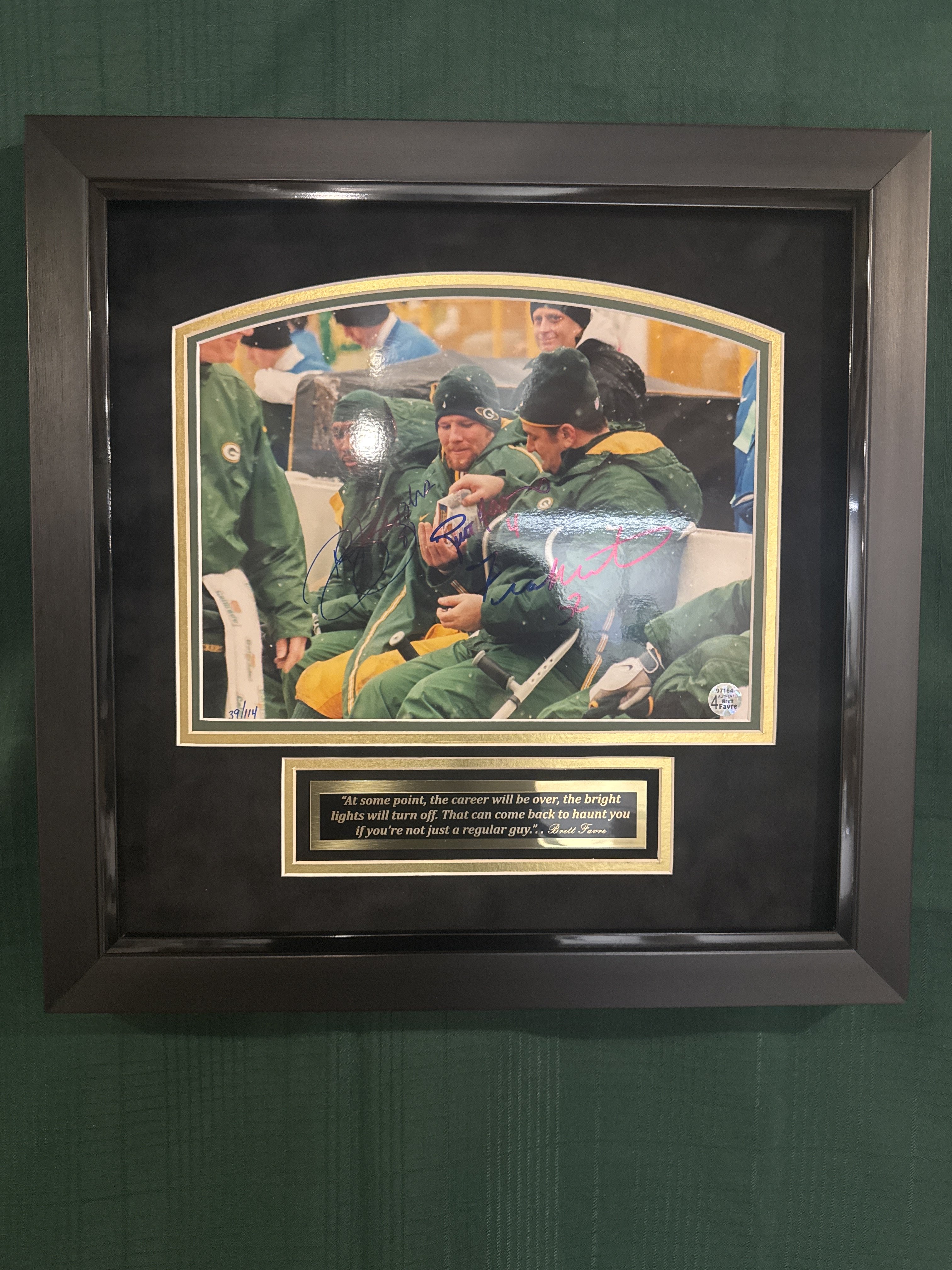 18 x 18 Photo of Robert Brett and Frankie sharing a bag of sunflower seeds on the sideline of Lambeau Field. Looks like a typical cold weather game and the boys are trying to keep warm. Great value with all three signatures. Don’t miss out on this one. Limited Quantity available!
